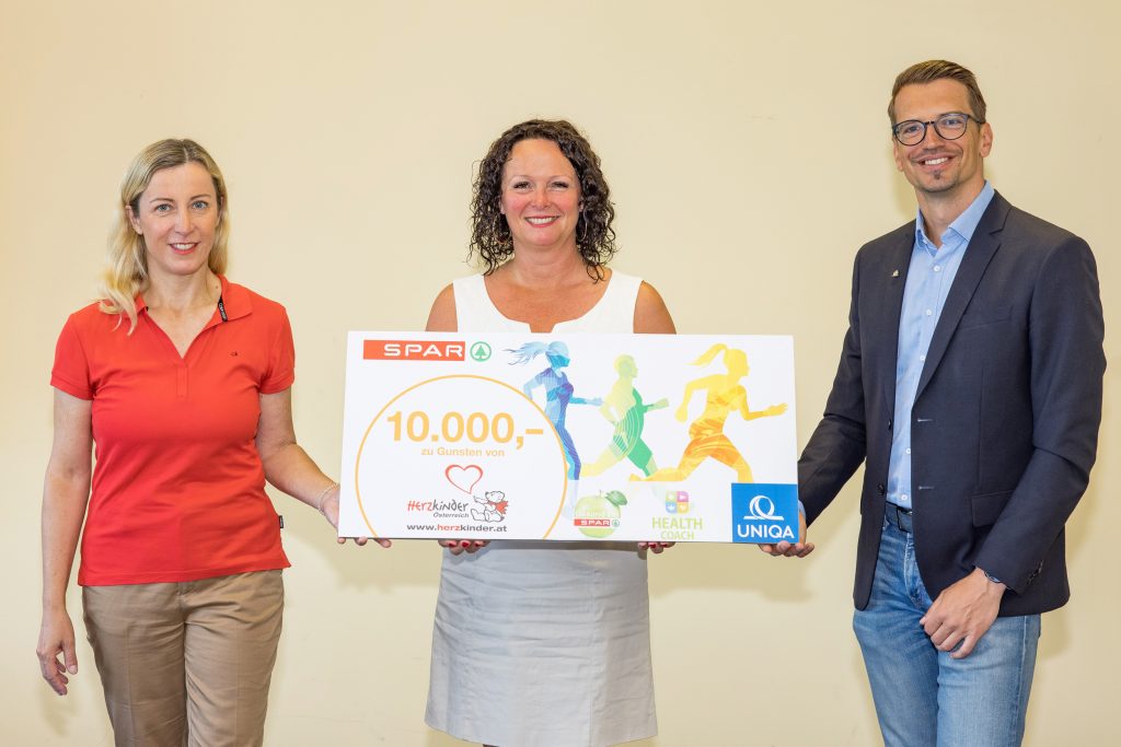 SPAR und UNIQA luden ihre Mitarbeitenden zu mehr Bewegung ein. Gemeinsam sollten 100 Millionen Schritte – das entspricht einer Weltumrundung – geschafft werden. Wird das Ziel erreicht, bekommt der Verein Herzkinder Österreich einen Scheck über 10.000 Euro. „Die Mitarbeitenden legten in fünf Monaten insgesamt 127 Millionen Schritte zurück“, weiß Michaela Altendorfer, Präsidentin und Geschäftsführerin von Herzkinder Österreich. Sie nahm in Salzburg den Spendenscheck von Dr. Renate Fellner-Färber, MBA, Leiterin des SPAR-Gesundheitsmanagements und Filip Kisiel, MA, Projektleiter von UNIQA HealthServices, entgegen.