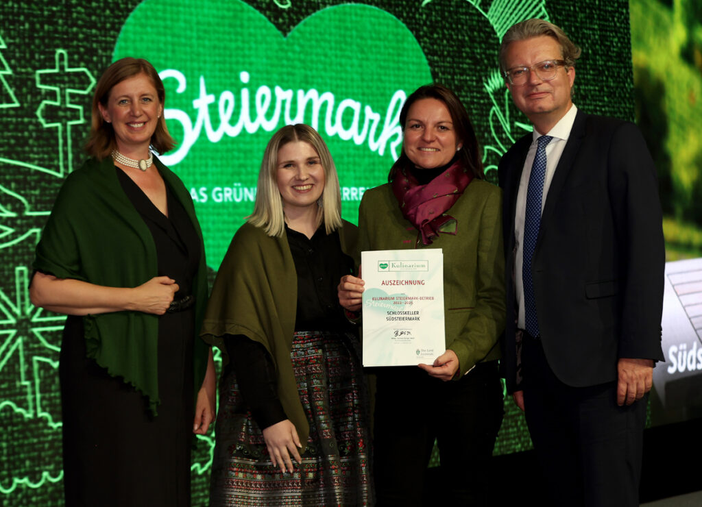 Bei der Kulinarium Steiermark Gala wurden 162 Gastronomiebetriebe aus allen Regionen der Steiermark – von der urigen Hütte bis zum Haubenlokal – von Tourismuslandesrätin MMag.a Barbara Eibinger-Miedl und Landeshauptmann Mag. Christopher Drexler ausgezeichnet. Sie alle ermöglichen Gästen echte steirische Genussmomente und bringen die zahlreichen Facetten der Steiermark geschmacklich auf den Teller. „So erfahren Gäste, wie das wahrhafte Lebensgefühl im Grünen Herz Österreichs schmeckt“, betont Markus Rath. Als Kulinarium Steiermark Betrieb darf sich der Schlosskeller Südsteiermark mit dem Gütesiegel „Grünes Herz“ schmücken. Gleichzeitig sind die Gastgeber nun offiziell Botschafter des guten Geschmacks, die mit regionalen Gerichten ihren Gästen einmalige Genussmomente bereiten. Alle 162 ausgezeichneten Betriebe sind im Kulinarium Steiermark Booklet vertreten und stellen hier die Besonderheiten ihres Betriebes vor.